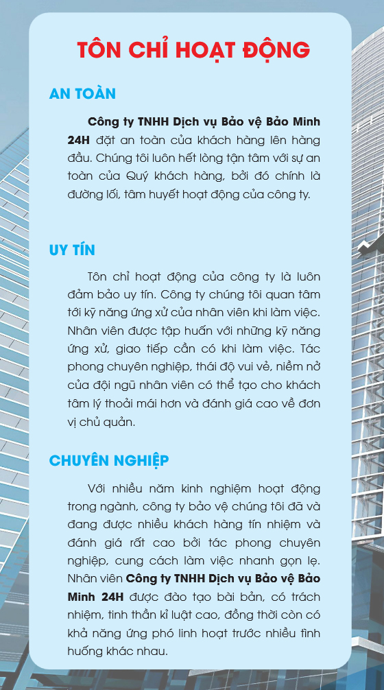 Sự CHUYÊN NGHIỆP, TỰ TIN, CHÍNH XÁC, AN TOÀN, HIỆU QUẢ, TIẾT KIỆM, TRUNG THÀNH – KỶ LUẬT của đội ngũ nhân viên BẢO VỆ AN NINH BẢO MINH 24h(đã được tuyển chọn xác minh lai lịch tốt) là phương châm chính trong hoạt động của công ty.