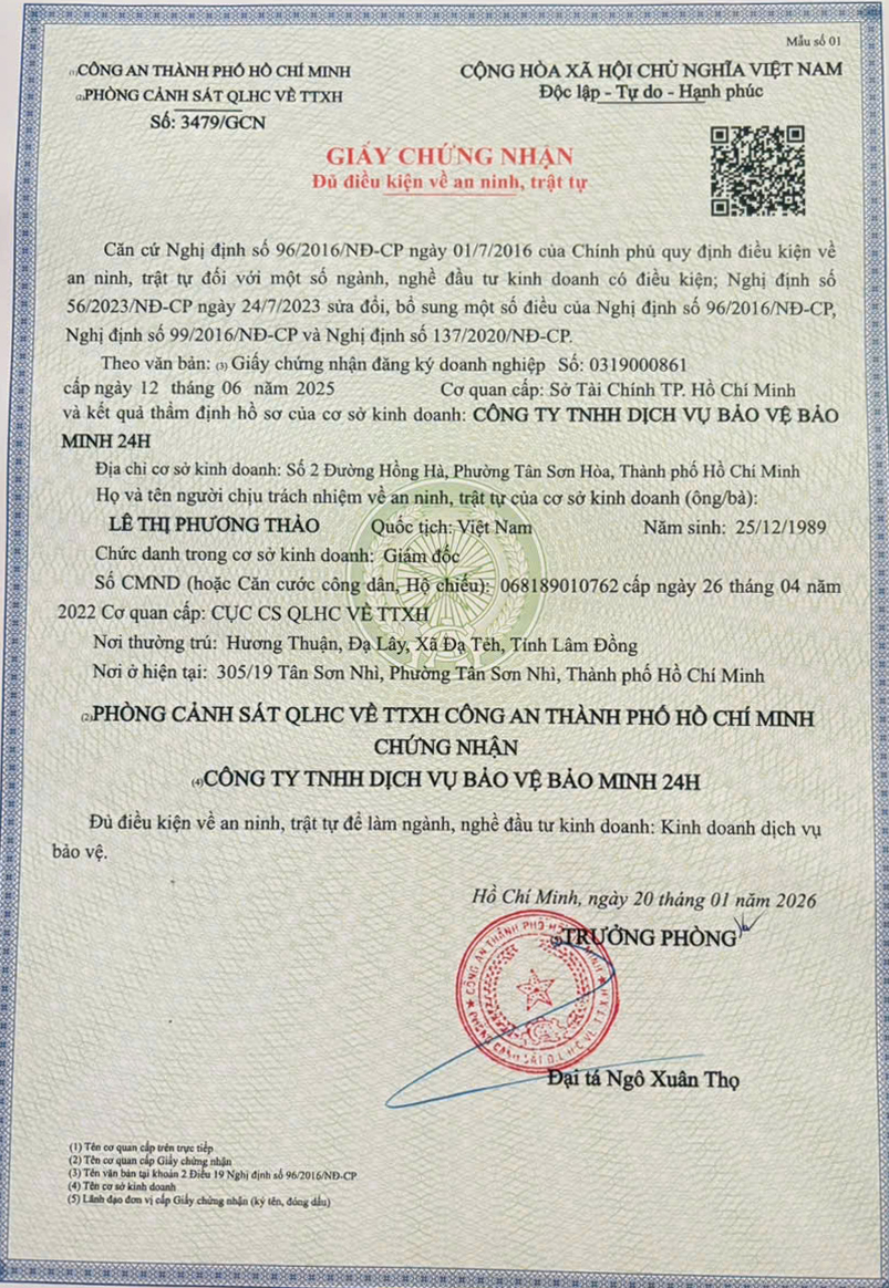 Công ty DỊCH VỤ BẢO VỆ AN NINH BẢO MINH 24h được Phòng đăng ký kinh doanh – Sở Kế Hoạch và Đầu Tư TPHCM cấp giấy phép đăng ký kinh doanh và Phòng CS QLHC TTXH Công An TPHCM cấp giấy chứng nhận đủ điều kiện về An Ninh Trật Tự để kinh doanh dịch vụ bảo vệ chuyên nghiệp.